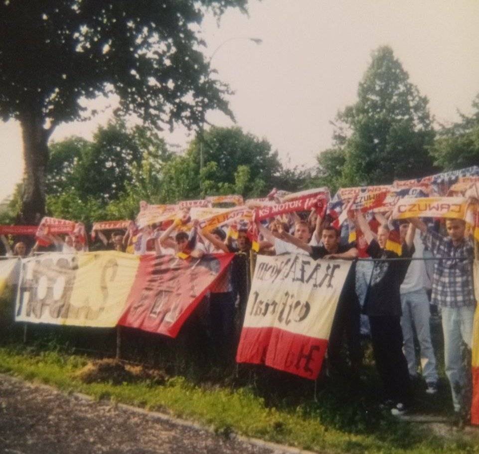 Opis: Spalone barwy Legii Warszawa oraz Olimpii Elbląg na meczu w Olsztynie (17 września 2005).